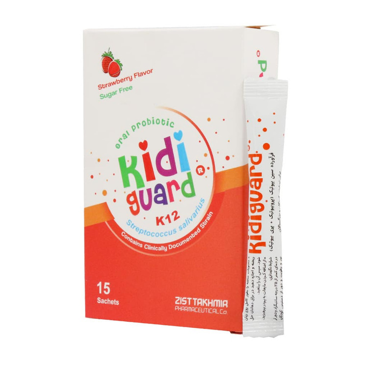 پودر کیدی گارد زیست تخمیر 15 ساشه، حاوی ترکیبی از پروبیوتیک استرپتوکوکوس سالیورایوسk12 و پری بیوتیک سوربیتول با توانایی کلونیزاسیون در مخاط دهان، به طور اختصاصی برای تقویت سیستم ایمنی و سلامت گوش، حلق و بینی فرموله شده است. کیدی گارد به فرم دارویی پودر حل شونده در دهان و به صورت ساشه های 15 عددی با طعم دلپذیر توت فرنگی برای نوزادان، کودکان و بزرگسالان تهیه شده و فاقد گلوتن است.