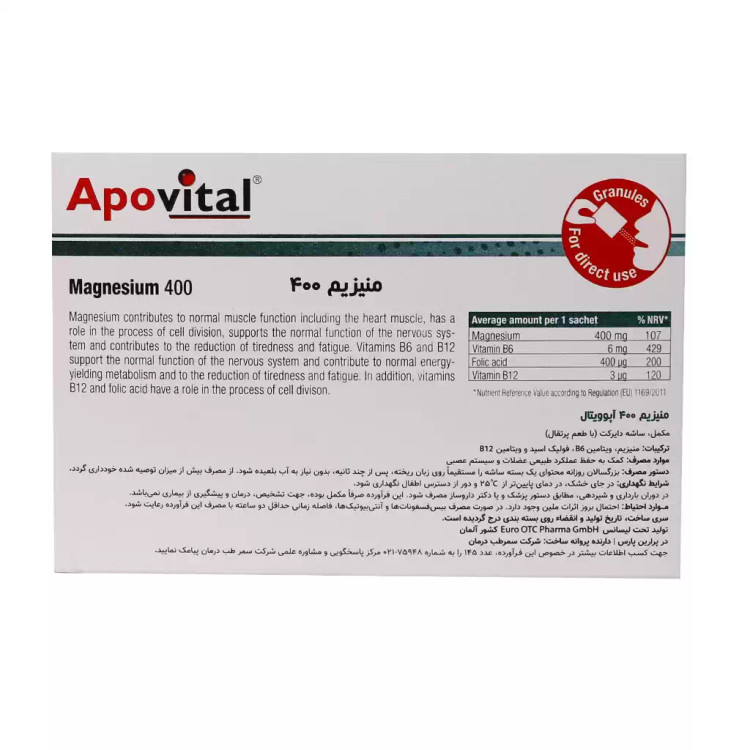 ساشه منیزیم آپوویتال 400 میلی گرمی، به عملکرد مناسب توده عضلانی و سیستم عصبی بدن کمک کرده. میتواند در بهبود عملکرد سیستم ایمنی، تشکیل گلبول های قرمز، سلامت سیستم قلبی عروقی، تنظیم فشار خون و سلامت اسکلت استخوانی بدن نیز کمک کننده باشد. ساشه منیزیم حاوی منیزیم، ویتامین B6، فولیک اسید (ویتامین B9) و ویتامین B12 است که در حفظ عملکرد طبیعی عضلات و بهبود گرفتگیهای عضلانی و عملکرد نرمال عضلات و سیستم عصبی موثر است.