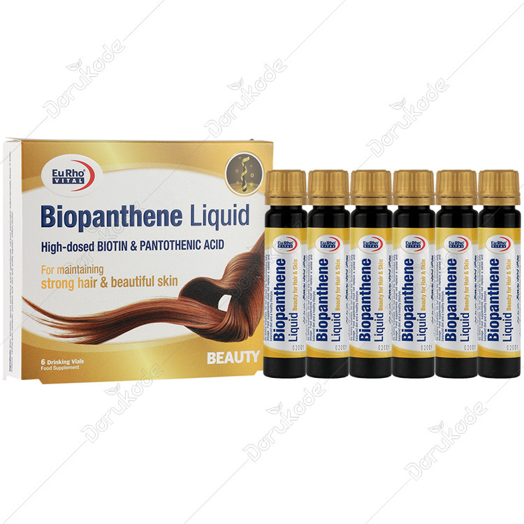 ویال بیوپانتن لیکوئید یوروویتال 6عددی، حاوی دوز بالایی از بیوتین (ویتامین B7) و پانتوتنیک اسید (ویتامین B5) بوده، که جهت کمک به حفظ سلامت پوست، مو و ناخن و مواردی همچون کاهش نازکی و ریزش مو، استحکام ناخن و شادابی پوست مورد استفاده قرار میگیرد. بیوتین به عنوان ویتامین B7 یا ویتامین H نیز شناخته میشود، نوعی ویتامین محلول در آب است که نقشهای متعددی در بدن ایفا میکند. این ویتامین در بهبود و جلوگیری از ریزش مو و حفظ سلامت پوست، مو و ناخنها موثر است.