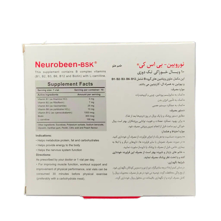 ویال نوروبین خوراکی بی اس کی (1000 میکروگرم)، محصولی مناسب و مقوی جهت تامین ویتامینهای خانواده گروه B بدن است. این محصول علاوه بر ب کمپلکس، B12 و ال کارنیتین دارد؛ بنابراین برای تامین انرژی و چربی سوزی هم بسیار مفید است. نوروبیون بی اس کی چندین ویژگی دارد، از جمله تامین انرژی بدن، افزایش عملکرد عضلات در فعالیتهای پرفشار مثل ورزش بدنسازی، همچنین بهبود عملکرد سیستم ایمنی و عصبی... علاوه بر این، ال کارنیتین موجود در این محصول که یک اسید آمینه مشتق است به بدن کمک میکند تا چربی و کربوهیدرات بدن به انرژی تبدیل شود.