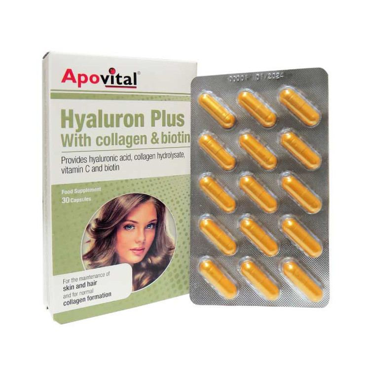 کپسول هیالورون پلاس آپوویتال 30 عددی، جهت کاهش چین و چروک پوستی و کمک به تقویت ساختار پوست، مو و ناخن در سنین بالا می باشد. که ساخت کلاژن را تحریک نموده، آبرسانی به پوست و مو را تقویت و استحکام بافت ناخن را افزایش می دهد. بدین ترتیب هیالورون پلاس آپوویتال با حفظ جوانی و شادابی پوست، روند پیری پوست را به تعویق انداخته و موجب بهبود ظاهر شما در دوران میانسالی گردد. حاوی ترکیب متعادلی از هیالورونیک اسید، کلاژن هیدرولیز شده، بیوتین و ویتامین سی می باشد که هر کدام به نحوی در جوانسازی و حفظ سلامت پوست، مو و ناخن نقش دارند. از دیگر ویژگی های کپسول هیالورون پلاس آپوویتال کمک به ترمیم زخم و آسیب های پوستی و به تعویق انداختن روند تشکیل چین و چروک های پوستی می باشد.