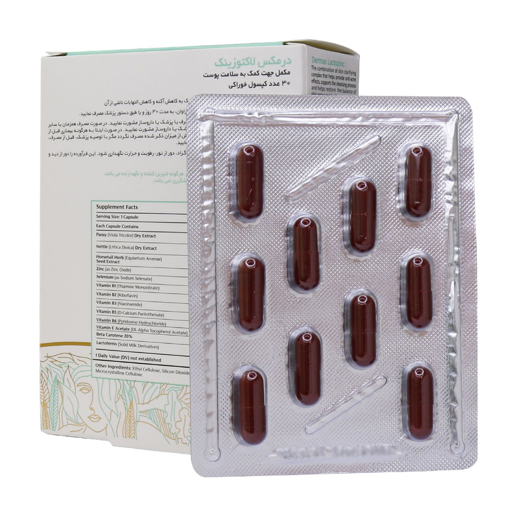 متاسفانه این کالا در حال حاضر موجود نیست. میتوانید از طریق لیست بالای صفحه، از محصولات مشابه این کالا دیدن نمایید.کپسول لاکتوزینک درمکس 30 عددی، با ترکیبات موثر به رفع مشکلات پوستی از جمله جوش، چربی پوست و کاهش آکنه و … میپردازد و به شما برای داشتن پوستی بهتر کمک میکند. همچنین لاکتوزینک در بهبود التهابات ناشی از آکنه، تاثیر بسزایی دارد. لاکتوزینک را میتوان بهترین مولتی ویتامین برای پوست دانست، چرا که دارای ریزمغذیهایی بوده که باعث ساخت کلاژن و افزایش استحکام پوست و حفاظت از سلولهای پوست، مو و ناخن میشوند. مزیت اصلی لاکتوزینک درمکس به عنوان قرص برای تقویت پوست و مو این است که این قرص توسط جریان خون، مواد مغذی را به عمیق ترین قسمتهای پوست هدایت میکند.