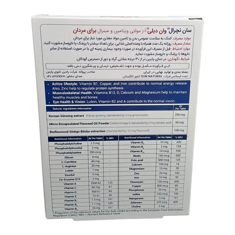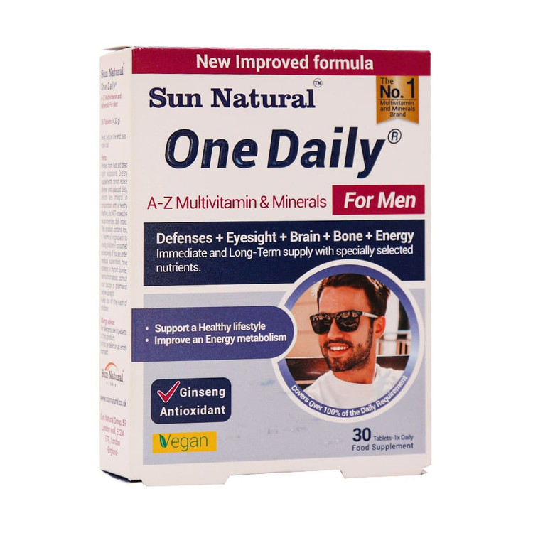 مولتی ویتامین و مینرال وان دیلی آقایان سان نچرال 30 عددی، این مکمل به تامین نیاز روزانه مردان به ویتامینها، مواد معدنی و مواد مغذی مفید کمک میکند. قرص وان دیلی آقایان سان نچرال یک مکمل عالی برای آقایان میباشد که به دنبال افزایش سطح انرژی و بهبود عملکرد روزانه خود هستند. همچنین با ترکیبات منحصر به فرد خود به سوخت و ساز مواد غذایی کمک نموده و خستگی را کاهش میدهد، عملکرد مغز و حافظه را بهبود میبخشد و با تقویت روند خونرسانی، احتمال کم خونی را کاهش میدهد. علاوه بر این با تقویت سیستم ایمنی، افزایش قدرت بدنی و حفظ سلامت استخوان، در بهبود کلی وضعیت جسمی و ذهنی موثر میباشد.
