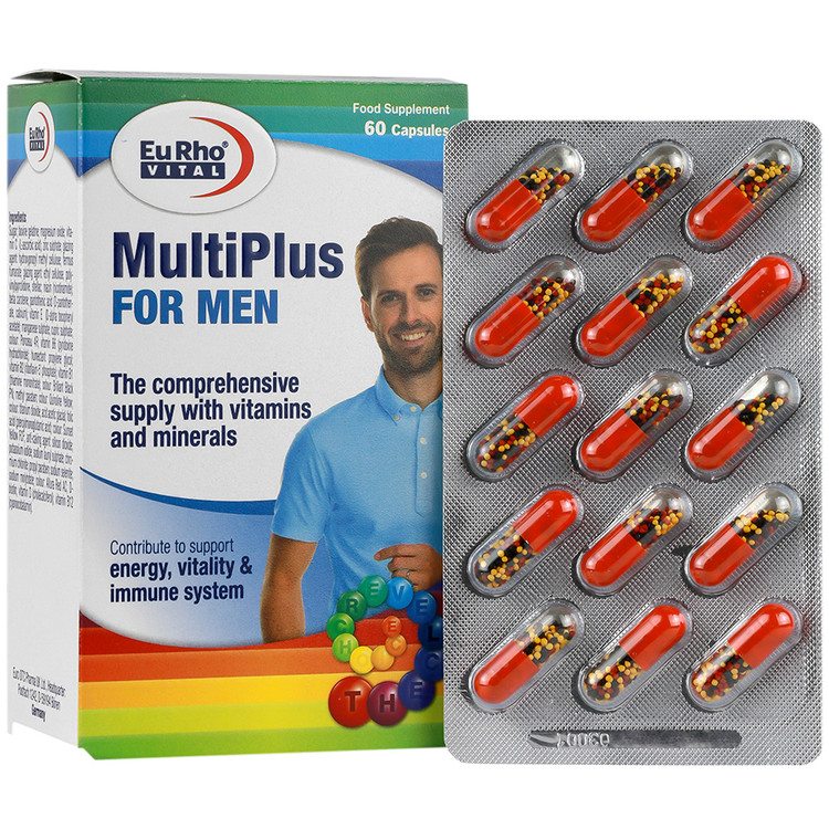 کپسول مولتی پلاس آقایان یوروویتال 60 عددی، حاوی مولتی ویتامین در کنار مواد معدنی همچون ید، آهن، منیزیم، مس، منگنز، زینک، سلنیوم، مولیبدن و کروم است و علاوه بر تأمین نیازهای تغذیه ای آقایان به افزایش انرژی و کاهش خستگی، تقویت سیستم ایمنی، سلامت پوست، مو و ناخن، بهبود عملکرد عضلات و سلامت تولید مثل در آقایان نیز کمک می کند.