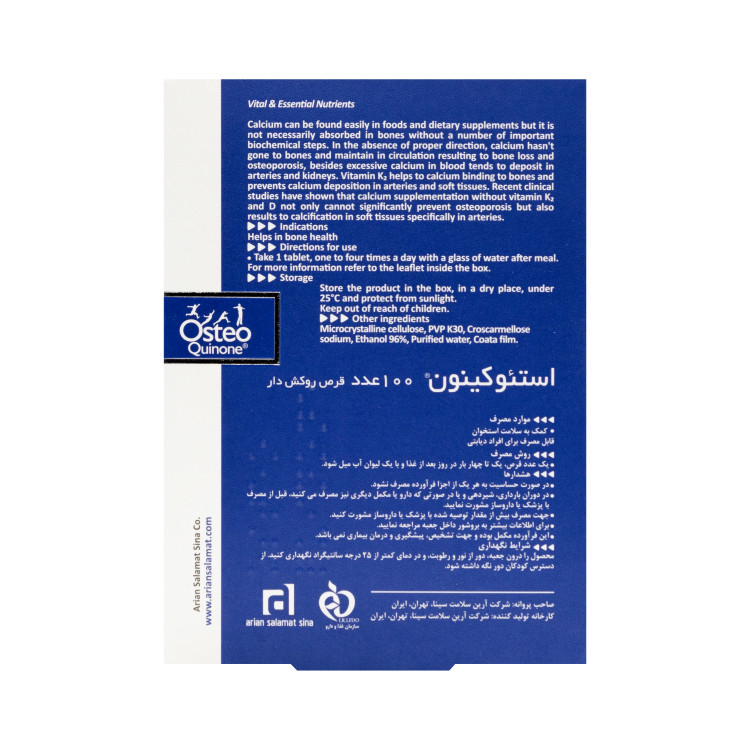 قرص استئوکینون هولیستیکا حاوی مقادیر کلسیم مورد نیاز بدن به همراه ویتامین K2 که موجب جذب موثر کلسیم در بدن میگردد، میباشد. مصرف این مکمل به مدت حداقل ۶ ماه در کاهش از دست رفتن توده استخوانی و افزایش غلظت مواد معدنی استخوانها موثر هستند. همچنین قرص استئوکینون با هدف تقویت سلامت استخوانها و پیشگیری از مشکلات اسکلتی تولید شده، و برای گروههای مختلفی مانند افراد در سنین رشد و نمو، زنان در دوران یائسگی و شیردهی، بیماران تحت درمان با داروهای کورتونی و افرادی که در معرض پوکی استخوان قرار دارند، توصیه میشود.