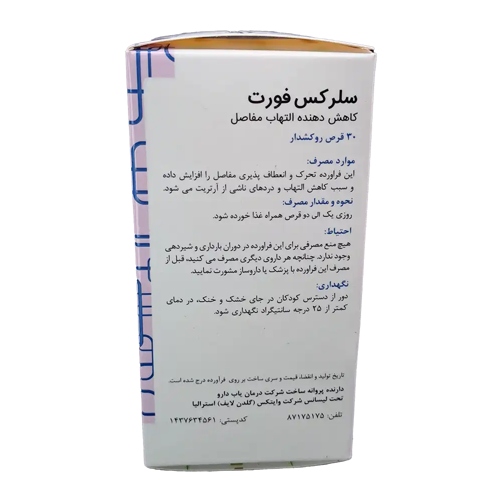 قرص روکشدار سلرکس فورت گلدن لایف تحرک و انعطاف پذیری مفاصل را افزایش داده و سبب کاهش التهاب و دردهای ناشی از آرتریت میشود. آرتروز یکی از شایع ترین بیماری های مزمن استخوان و مفاصل است. در این بیماری، التهاب در مفاصل و تجزیهی غضروف ها رخ می دهد. غضروف یک بافت لغزنده است که باعث سهولت حرکت استخوان ها بر روی یکدیگر می شود و در صورت تجزیه و تحلیل آن ساییدگی استخوانها در محل اتصالشان رخ می دهد که منجر به درد، تورم و سختی در حرکت می شود. قرص سلرکس فورت یک فرآورده طبیعی برای کاهش التهاب مفاصل میباشد.