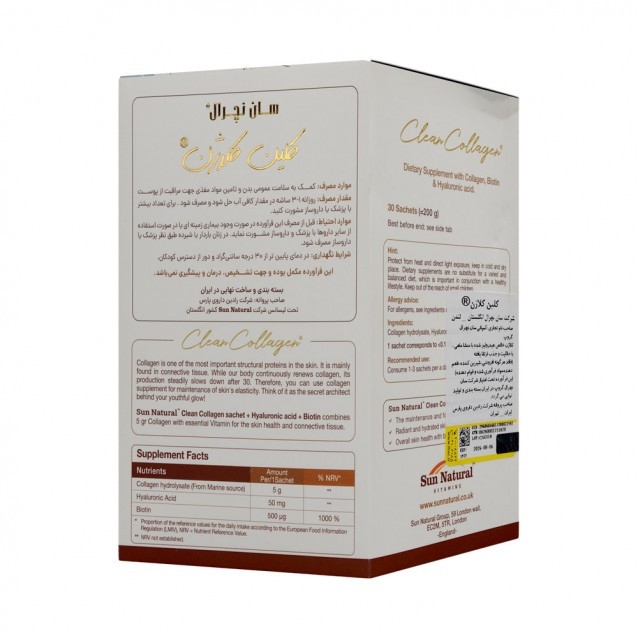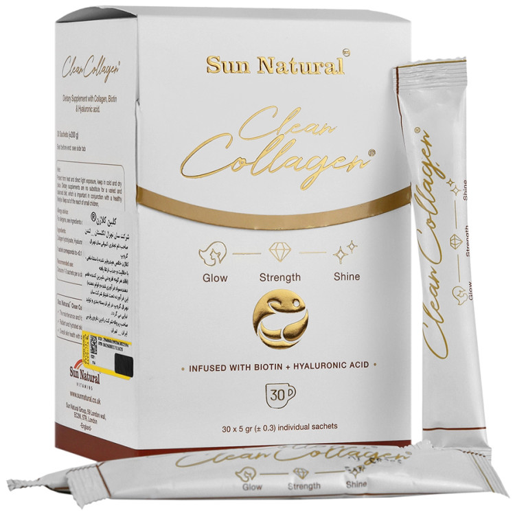 کلین کلاژن مکمل غذایی حاوی 5 گرم کلاژن هیدرولیز شده با منشا ماهی، 50 میلیگرم هیالورونیک اسید و 500 میکروگرم بیوتین در هر ساشه است که به افزایش خاصیت ارتجاعی پوست، کاهش چینوچروک، بهبود رطوبت پوست، کاهش علائم پیری زودرس و تقویت ساختار مو و ناخنها کمک میکند. کلاژن نقش مهمی در حفظ ساختار، خاصیت ارتجاعی و رطوبت پوست ایفا میکند. مطالعات نشان دادهاند که مصرف کلاژن هیدرولیز شده میتواند به کاهش چینوچروک، بهبود آبرسانی پوست و افزایش تولید کلاژن در لایه درم کمک کند. کلین کلاژن یک مکمل غذایی پیشرفته، بهطور خاص برای بهبود سلامت پوست، تقویت مو و ناخنها، حمایت از سلامت مفاصل، تقویت استخوانها، افزایش توده عضلانی و جوانسازی پوست کاربرد دارد.