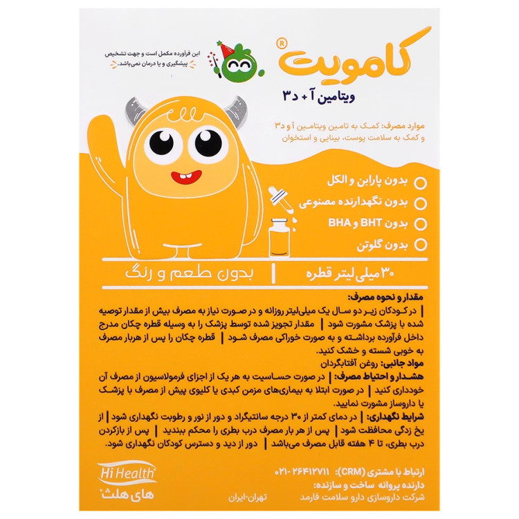 قطره کامویت های هلث محصولی مناسب برای تامین نیاز روزانه کودکان به ویتامین A و D است. این قطره به رشد و استحکام استخوانها و دندانها، جلوگیری از پوسیدگی دندانها، متابولیسم کلسیم و فسفر، عملکرد مناسب ماهیچهها و سلامت بینایی کمک میکند. قطره کامویت حاوی 1500 واحد بین المللی ویتامین A و 400 واحد بین المللی ویتامین D به ازای هر میلیلیتر است که بهمنظور تامین نیاز روزانه به این دو ویتامین از بدو تولد تا پایان دوسالگی طراحی شده و در رشد و استحکام استخوانها و دندانها، متابولیسم طبیعی کلسیم و فسفر، عملکرد طبیعی عضلات، حفظ سلامت سیستم بینایی و رشد و تکامل مناسب ذهنی و فیزیکی موثر است.