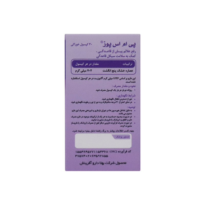 کپسول پی ام اس پوز بهتا دارو جهت رفع علائم پیش از قاعدگی و کمک به سلامت سیکل قاعدگی در زنان استفاده میشود. حاوی عصاره میوه گیاه پنج انگشت به منظور کمک به سلامت سیکل قاعدگی، رفع علائم پیش از قاعدگی و یائسگی همچنین بهبود تنبلی تخمدان در زنان، تنظیم هورمون های زنانه، به تسکین مشکلات هورمونی مرتبط با چرخه قاعدگی و علائم آزاردهنده یائسگی کمک می کند.