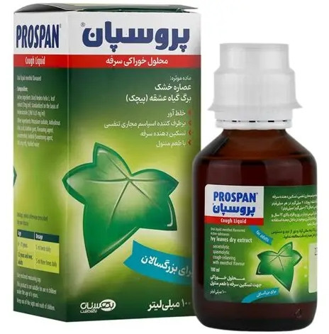 1.: پروسپان با طعم منتول حاوی 7 میلیگرم عصاره خشک برگ گیاه عشقه (پیچک) به ازای هر میلیلیتر شربت، استاندارد شده بر اساس هدراکوزید C (0.35 میلیگرم به ازای هر میلیلیتر شربت)