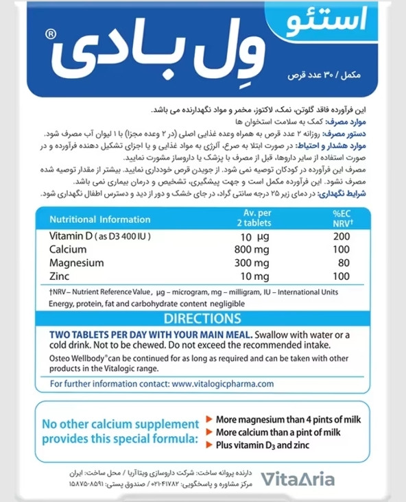 1.: اُستِئو وِلبادی با ترکیب متعادل از کلسیم، منیزیم، روی و ویتامین D3 به بهبودی پس از شکستگی استخوانها، تسریع بازسازی و بازگشت سریعتر به فعالیت کمک میکند