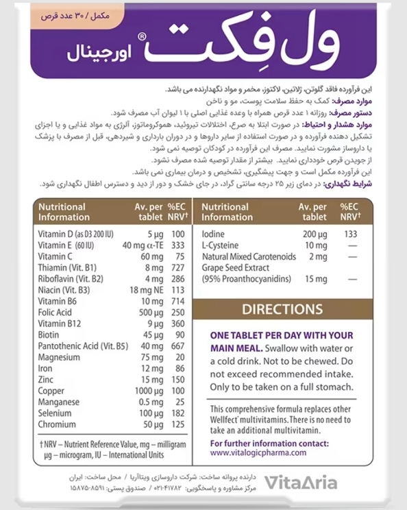 2.: وِلفکت اورجینال با فرمولاسیونی تخصصی از زیبایی شما محافظت و پشتیبانی میکند. این مکمل تغذیهای با ترکیبی هدفمند از ریزمغذیهای موثر به تغذیه لایههای عمیق پوست، تقویت فولیکولهای مو و محافظت از مو در برابر خشکی، شکنندگی و آسیبهای محیطی کمک میکند.