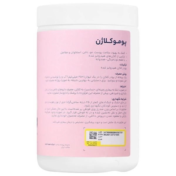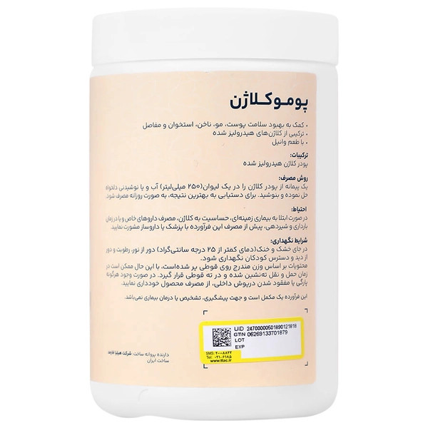 1.: پومو کلاژن، حاوی 10 گرم کلاژن هیدرولیز شده گاوی به ازای هر سروینگ