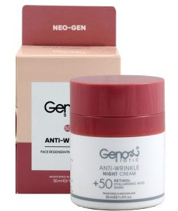 کرم ضد چروک شب ۵۰+ سال ژنوبایوتیک بر پایه یکی از مشتقات ویتامین A یعنی رتینول کپسوله شده تهیه شده است تا سبب افزایش متابولیسم و انرژی رسانی به سلول ها شود. همچنین باعث لایه برداری ملایم و حذف سلول های مرده می شود و در نتیجه رفع کننده چین و چروک های عمیق صورت است.