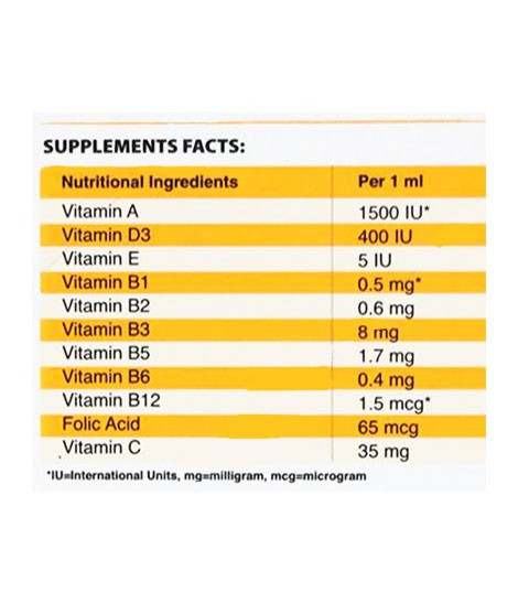 - حاوی ویتامین A، ویتامین D، ویتامین E، ویتامین C و ویتامینهای گروه B